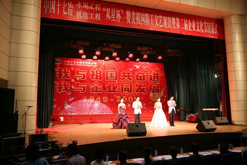 人民会堂里洋溢着欢乐和喜庆的气氛。舞台上方悬挂着“中国十七冶水泥工程、机电工程‘双星杯’赞美祖国职工文艺演出暨第二届企业文化节闭幕式”的大型横幅。“我与祖国共奋进,我与企业同发展”的主题背景在灯光的照耀下格外醒目。