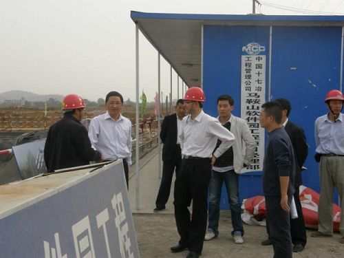 10月19日下午,马鞍山市副市长金庆丰在花山区有关负责同志的陪同下,视察了由十七冶工程管理公司承建的市软件园工程。工程管理公司经理张伟典、软件园工程项目部经理严发德陪同视察。 金副市长在察看了施工现场后,详细地询问了工程进展情况,项目经理严发德一一作了回答,金副市长表示满意,并对该工程项目前期工作给予了充分的肯定。他希望项目部抓住当前大好施工季节,抢抓工期,力争多干,又好又快地完成软件园工程。