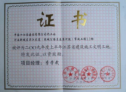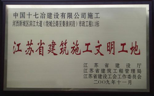 经过专家组的现场考核和江苏省建筑文明工地审定委员会的审定,批准授予中国十七冶南京河西新城区滨江大道1.1标工程“江苏省2009年度省级文明工地”的荣誉称号。
