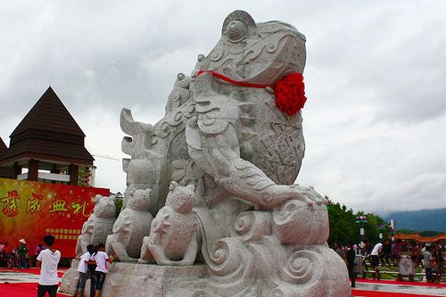 该旺蛙雕塑由一只巨蛙八只小蛙构成,高