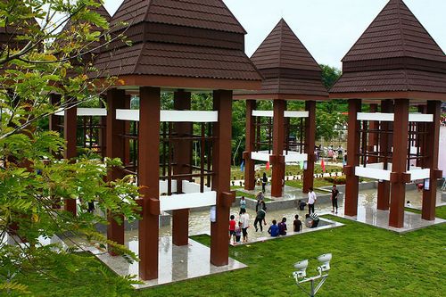 七仙文化广场上,七座颇具热带风情的亭台吸引了大批的游人,亭台中,人们或停歇,或赏园,或观景,孩童嬉水,老人言谈,这就是海南分公司保亭项目部全力打造的又一精品——七仙观景亭(台)。