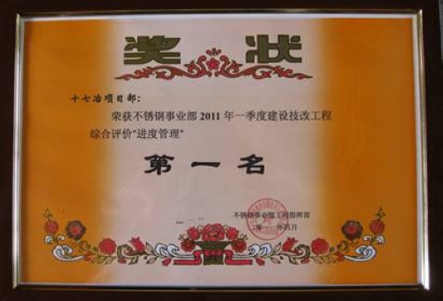 近日,在宝钢股份不锈钢事业部召开的工程建设创“双优”推进会上,我公司承建的不锈钢炼钢原料使用技术研究创新项目被评为宝钢股份不锈钢事业部2011年一季度建设技改工程综合评价“进度管理”笫一名,受到表彰。