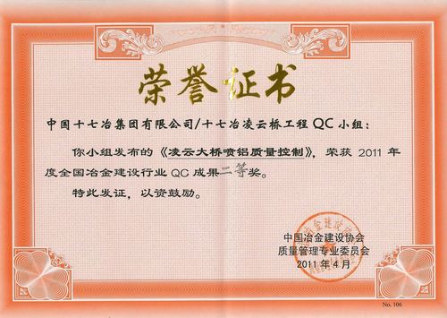 获得安徽省科学技术奖三等奖的项目成果是《黄山云谷索道建设工程》,由冶金工程技术公司研发;获得2011年度全国冶金建设行业优秀QC成果二等奖的有《凌云大桥喷铝质量控制》、《开展QC活动,控制沉井下沉偏差》、《采用公差理论控制沥青路面施工厚度》、《提高减定径机组润滑管道冲洗质量》和《提高梅钢二期公辅工程砼建(构)筑物的观感质量》等5QC成果。
