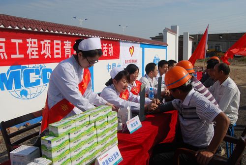青年志愿者们为现场工人进行了体检,发放了健康知识手册和免费药品,认真解答了相关询问。团市委领导还为现场工人发放了苹果等慰问品。
