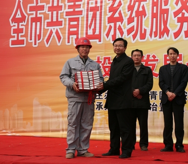 在现场,团省委副书记周密向由一线建设者组成的青年突击队代表授旗。全市志愿者为工地捐赠图书400余册,并建立了“青工书屋”,团市委副书记郭兴龙向一线建设者捐书。