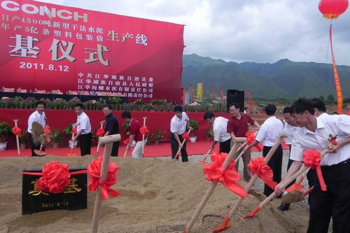812上午,湖南江华海螺2×4500t/d水泥生产线及9MW余热发电工程正式开工。湖南省永州市市委副书记唐松成,副市长刘尤碧,政协副主席盘玉花,江华县委书记罗建华,海螺集团总经理助理、海螺水泥股份公司副总经理汪鹏飞,公司总经理助理、水泥工程技术公司经理曹永忠等领导出席了奠基仪式。