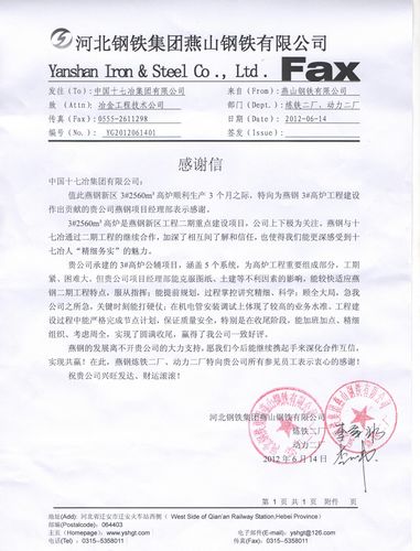 614,燕山钢铁有限公司向中国十七冶集团发来感谢信,对于十七冶冶金工程技术公司燕钢项目部为燕钢新区3#2560m3 高炉顺利投产并保持高效运行,所付出的努力表示衷心感谢。