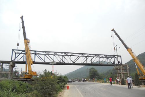 库山石灰石廊道全长2.5km,共193个支架,高低落差大,地理结构复杂,施工难度大。其中最关键的部位跨省道钢桁架长40m,重约34t,因其横跨芜湖市繁昌县S216省道,致使吊装作业受道路通行限制,且作业面狭窄,吊装难度较大。为高效优质的完成吊装任务,吊装之前,芜湖海螺三期项目部仔细研究,精心组织,结合现场实际情况报批吊装方案,并积极与业主、当地交通管理等部门沟通协调交通管制、吊装场地安全维管等事宜,从而确保了库山石灰石廊道的全线贯通。