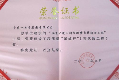 近日,由十七冶市政工程技术公司承建的马鞍山市江东大道三期阳湖塘大桥建设工程,顺利通过马鞍山市优质工程奖评审,荣获2012年度马鞍山市建设工程质量“翠螺杯”奖。