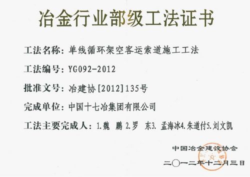 获得2012年度冶金行业部级工法的有:冶金工程技术公司的《单线循环架空客运索道施工工法》和《插拔式高压终端制作工法》、城建工程技术公司的《长螺旋钻干法成孔抗浮锚桩施工工法》和《土钉墙基坑支护加筋水泥土锚桩施工工法》,风力与太阳能发电工程技术公司的《2MW海上风力发电机安装工法》。