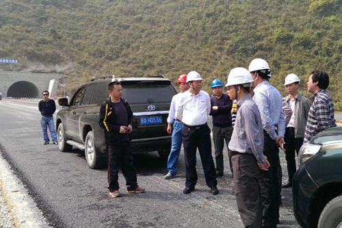 327上午,广西交通投资集团有限公司董事长、党委书记余昌文,靖那高速公路指挥长颜景有,百靖高速常务副指挥长劳家荣,中冶京诚常务副总经理吕卫东,百靖高速总监办总监廖东生一行视察了由中国十七冶集团交通工程技术公司承建的百靖高速公路NO.1标项目。