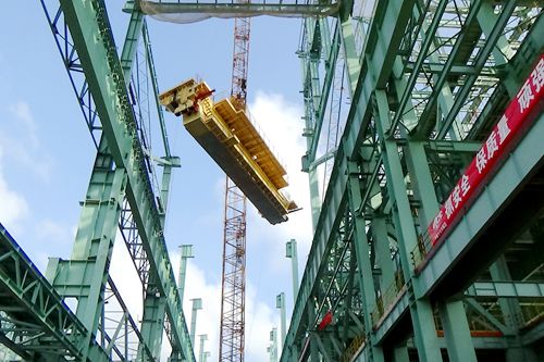 11月1日上午,湛江炼钢工程正式拉开了首台行车吊装的序幕。由广东十七冶建设有限公司承建的宝钢湛江钢铁炼钢项目的炼钢主厂房内,壹台350吨大型履带塔吊将首台起重量为500吨、跨度为21.4米,高28.6米的行车高高吊起,缓缓的、稳稳地落入行车轨道,行车吊装一次成功就位,正点安装成功。