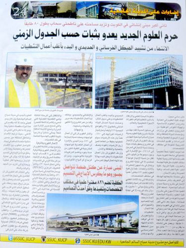 日前,科威特大学城业主在其最新一期内刊第24版“聚焦科威特大学城” 以《科学学院项目进展迅速,形势喜人》为题,用整版的篇幅对科学学院项目的进展情况进行了详细介绍并给予高度评价,对十七冶在工程建设过程中表现出的责任感和创造力进行了表扬。