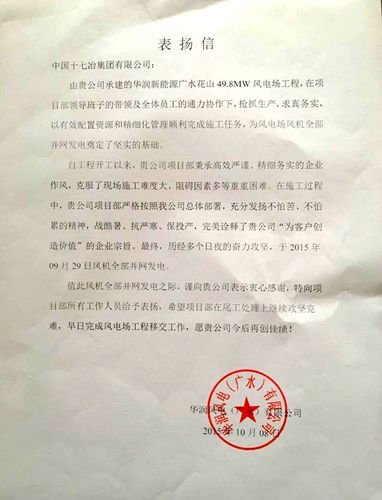 1116,华润风电(广水)有限公司致信中国十七冶集团公司,感谢风力与太阳能发电工程技术公司承建的华润新能源广水花山49.8WM风电场工程顺利完成建设任务,全部风机并网发电。表扬项目部在施工中充分发扬不怕苦、不怕累的优良传统,战酷暑、抗严寒、积极抢抓施工进度,优质出色地完成了施工任务。
