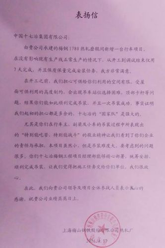 420日下午,中国十七冶集团冶金工程技术公司承建的上海梅山钢铁股份有限公司热轧厂1780热轧磨辊间新增一台行车顺利完成载荷试验,该工程全部施工任务圆满完成。梅钢公司热轧厂特表扬信以示感谢。