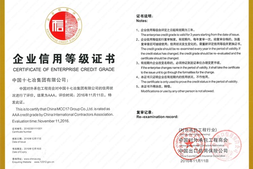 1220日,中国十七冶集团收到对外承包工程商会和中国出口信用保险公司颁发的AAA企业信用等级证书和牌匾,被评为2016年对外承包工程企业最高信用等级AAA级企业。