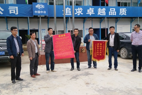 56日,贵州省望谟县边饶镇副镇长韦维等一行代表边饶镇政府将一面绣有“路地携手共建,谱写鱼水情深”的锦旗和大红感谢信送到中国十七冶集团交通工程技术公司贵州紫望项目部,对项目部拓宽改建边饶镇喜座村村道、造福百姓表示诚挚的感谢。