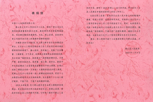 1月8日,山东省梁山县政府向中国十七冶集团发来表扬信,表扬十七冶山东分公司在梁山文化中心项目建设上的贡献,尤其是大剧院在元月4日成功举办了2019“水浒故里·忠义梁山”新年音乐会,充分展现了十七冶人敢打敢拼、干就干好的精神风貌。
