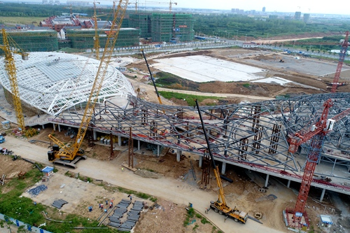 滁州高教科创城文体活动中心工程项目是滁州市十大重点工程之一,也是安徽省“861”重点项目,位于滁州市南谯新区乌衣镇内,建设用地面积168227平方米,总建筑面积73257.86平方米,包括手球馆、文化中心及游泳馆。工程采用框架加钢屋盖的结构形式,造型为祥云形状,象征的人与自然、人与社会、建筑与环境三方面的和谐。工程建成后,对内是滁州市开展各类体育活动和广大市民健身娱乐、休闲游艺的中心场所,对外将成为南谯区的新名片,在经济、文化、旅游对外宣传和交流等方面产生多种效能。本项目三个场馆将承办2019年举行的世界手球大赛及2020年安徽省省运会。