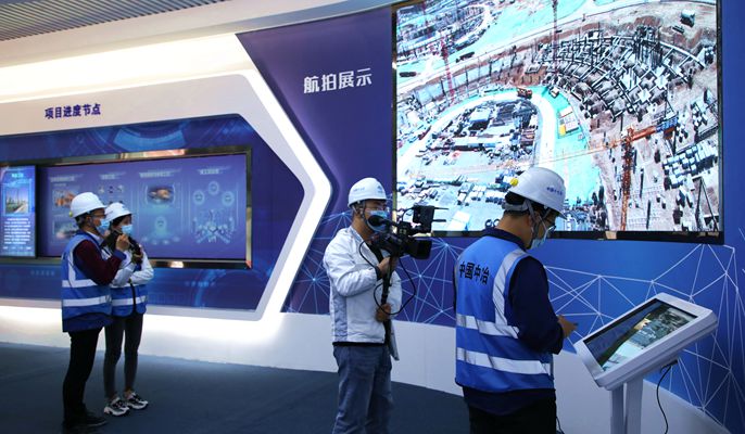 在奥体科技馆展示阶段,媒体记者通过画面跟随视频主播,逐一观摩了“BIM技术施工模拟、VR实景体验项目、5G无人塔吊模型、3D打印场馆模型、智能机器人、项目大事记及工程节点。