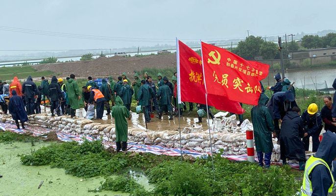 在和县历阳镇城西村、大许自然村,哪里有汛情,哪里就有突击队的身影。险情就是命令,时间就是生命。中国十七冶集团始终践行央企社会责任,勇立潮头,无畏担当。从抢战牛沌河、急战双桥河,到突击得胜河、夜战黄坝,再到突袭石跋河、援助滁河,五天六场,一刻不停转战230公里,累了就在车上或者就地而眠,“洪水不退,我们不退;堤口要守,我们在前!”汛情当前,党员当先,这是突击队在堤坝作出的庄重承诺。