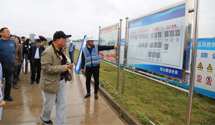 在项目部主要负责人的陪同下,与会人员来到施工现场,通过现场观摩工地智慧化运行,辅以项目部技术负责人对运项目建设概况、建设背景、战略意义、BIM技术应用、智慧工地建设、门禁系统使用、安全环保工作等方面的介绍与展示,直观地感受到智慧化发展对于工地建设、现场施工等方面的重大意义。