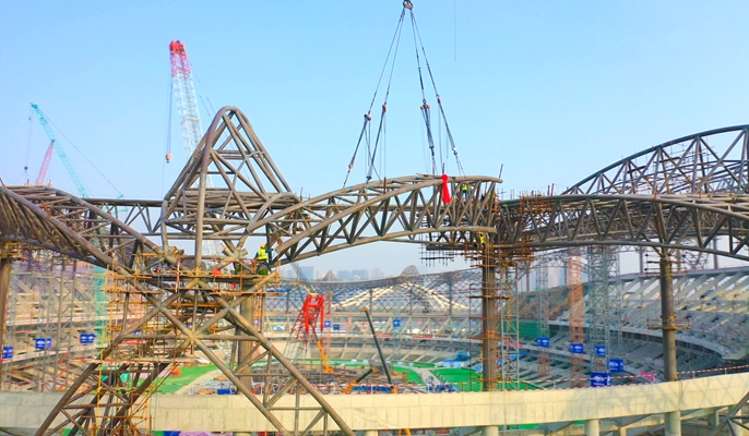 随着300吨履带吊的轰鸣声响起,外环最后一榀桁架缓缓升起并精准落位,标志着体育场外环钢结构正式合龙,巨型“玫瑰”靓丽绽放。体育场整体结构由下部看台劲性钢骨柱和顶部罩棚钢结构组成,总用钢量达1.9万吨,杆件总数达4.6万件,建成之后能容纳6万座。体育场钢结构由40榀空间交叉落地管桁架和20榀出屋面桁架组成,形成玫瑰花瓣造型,出屋面桁架悬挑33米至44.5米,主结构顶标高为40.559米至60.563米,桁架由Q355C、Q390C、Q460C等材质管件与铸钢件拼装、焊接而成。
