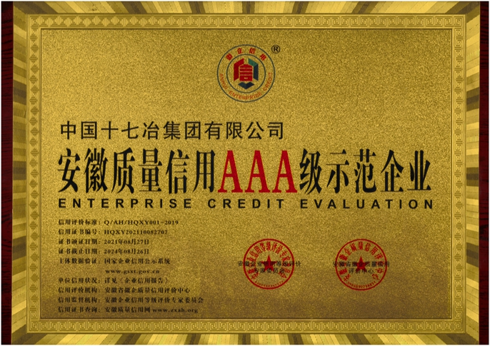 8月31日,中国十七冶集团收到安徽省徽企质量信用评价中心颁发的荣誉证书,公司被评定为“安徽质量信用AAA级示范企业”。