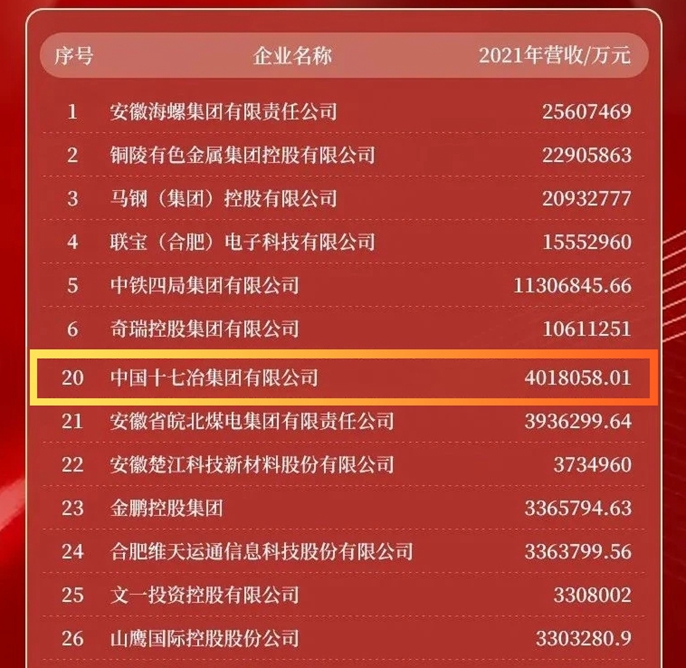 12月12日,安徽省企业联合会、省企业家联合会发布2022安徽省百强企业榜单,中国十七冶集团稳居安徽省百强企业第20位。