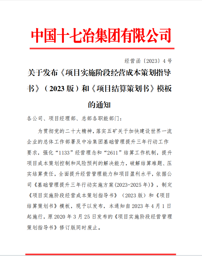 聚焦价值创造,建设创效文化。中国十七冶坚持践行大商务管理文化,将企业文化和管理理念、专项行动有机融合,以效益优先为目标导向,以贯彻落实中冶集团“基础管理提升三年行动”和《工程管理手册》为重要抓手,引导员工牢固树立践行创效意识,不断努力追求卓越经营成果。公司紧紧扭住经营预算、成本锁定、项目运营等关键点,全面贯彻实施“1133”经营理念和“2611”结算工作机制,构建起成本策划、成本锁定、成本纠偏、责任落实、结算落地等有效闭环、科学完备的成本管理制度体系,推动降本增效“大文章”在基层项目落地生根,形成了“经营围绕成本算、生产围绕成本干、管理围绕成本转”的良好氛围。