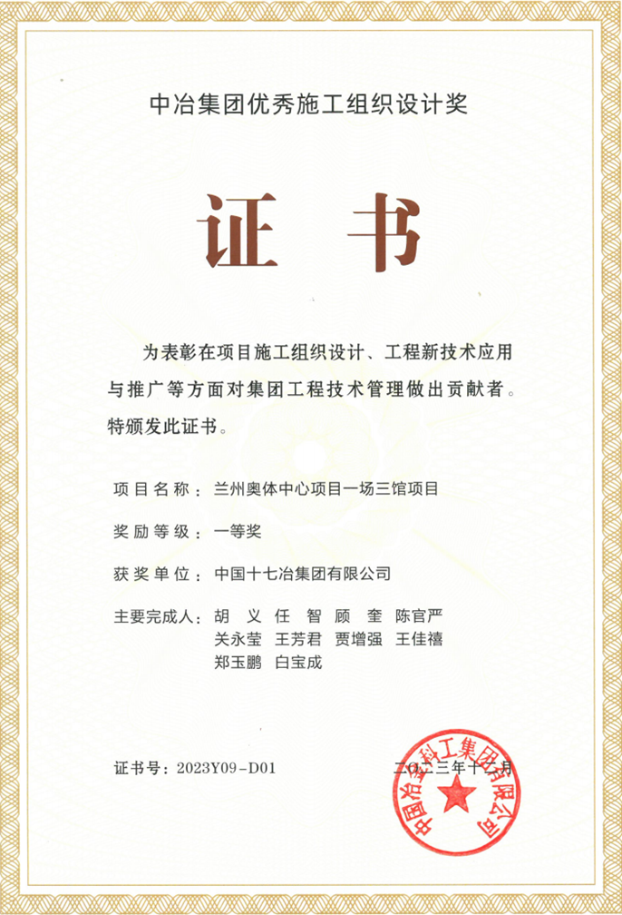 兰州奥体中心一场三馆项目荣获中冶优秀施工组织设计奖一等奖