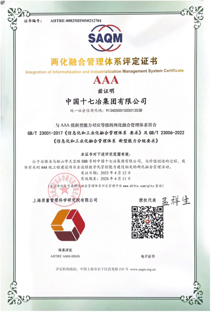 近日,中国十七冶顺利通过国家工信部“两化融合管理体系AAA级再评定。自2022年首次获得两化融合管理体系AAA级认定以来,公司在信息化与工业化深度融合方面持续深耕,此次再评定的顺利通过是对公司在信息化与工业化融合领域卓越实践的再度认可,充分彰显了公司在数字化建设进程中稳步向前的坚定步伐,为公司实现打造“全国一流、行业领先的工业化、数字化、绿色化、智能化建筑运营服务商”目标提供了有力支撑。