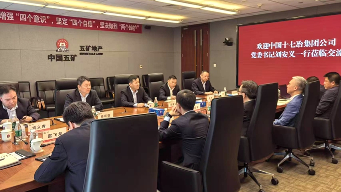 4月24日,中国十七冶集团党委书记、董事长刘安义到北京市,拜会了五矿地产党委书记、董事长何剑波,双方就进一步深化合作展开友好交流。五矿地产党委副书记、总经理戴鹏宇,副总经理杨尚平、雷飞龙,中国十七冶党委委员、副总经理张杰等参加会见。