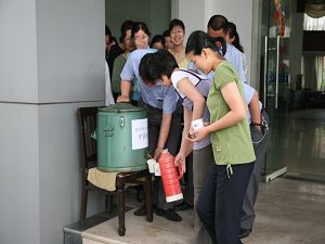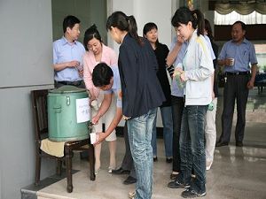 5月25日上午,公司爱卫会组织总部大楼300名员工在食堂门前饮用预防甲型H1N1流感中药汤。这是公司爱卫会开展的为期5天的中药预防措施,体现出公司对员工的深情关爱。