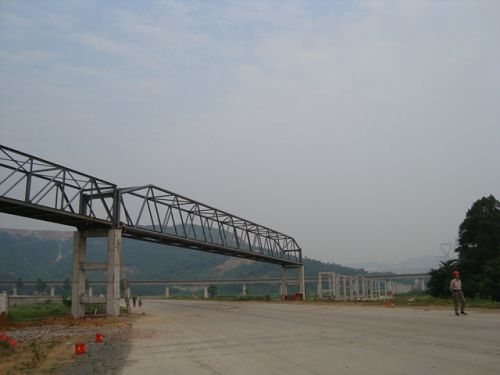 此次跨钢桁架跨度55.5m,为钢管构件,重量约53t,两端为砼支架,跨越沿新公路,吊装难度较大。此段廊道跨越已经通车的公路且车流量较大,在吊装前由交通管理部门,在道路两端设置告示牌,并由交警部门进行交通管制,道路全封闭,为确保成功吊装,该项目部优化施工方案,采用一台70t、两台25t抬吊,相互配合,确保了该钢桁架一次就位成功。