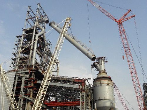 7月28日下午18时18分,吉钢2#高炉下降管顺利就位。至此,高炉本体大型钢结构安装全部结束。 下降管吊装是2#高炉主体最后一个大件。下降管上端与上升管正三通相连,下端与重力除尘器相连,其长度为54.47m,内径φ3000㎜。下降管安装难点主要在于安装高度高,最高处达86.75米;重量重,总重约100吨;安装精度高,下降管安装坡度为50.0754°。吉钢项目部精心组织和安排,通过劳动竞赛等多种方式,强化安全、质量控制,确保工程稳步向前推进,如期完成2#高炉钢结构安装。
