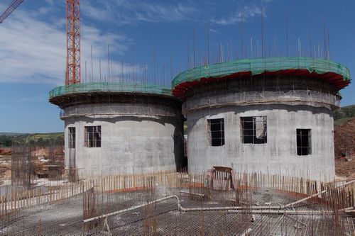 该子项由6个体型相同的水泥库组成,直径均为18m,库底板以下库体为钢筋混凝土筒中筒结构。该子项71开始施工,为了抓好节点计划的落实,项目部组织多次召开技术质安专题会,做好预案交底;特别是面对临夏施工现场海拔高、自然条件恶劣且多暴雨和地材匮乏的特点,项目部领导班子“以一天也不耽误,一天也不懈怠”的工作状态,带领施工人员加班加点冒雨作业,共浇筑混凝土769m³,有力地保障了2#5#6#水泥库库底板滑模。