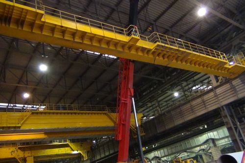 该行车的两个自重分别为27吨和23吨的巨型大梁,在汽车吊的提升下徐徐升空,两个巨型行车主箱梁先后准确就位在轨道面标高12、跨度为31的行车轨道上,主梁与轨道实现精准合龙,行车吊装取得圆满成功。由于吊装现场处于厂房内,场地狭小,施展困难,加之设备总重总积过于庞大,项目部利用甲方生产间隙,将该行车分节吊装,吊装就位后组对成型,干净利落地圆满完成了吊装任务,受到甲方赞誉。