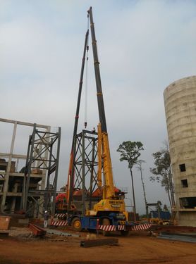 马来西亚PHOENIX LAKE SDN BHD斯里加亚选矿厂技改工程位于彭亨州斯里加亚镇,属热带雨林气候,无明显的四季之分,天气炎热且多雨。该工程包含了铁选矿厂的一般工艺流程,如高压辊磨系统,打散筛分系统,磨矿分级及弱磁选别系统,强磁选别系统,强、弱磁精矿过滤系统,中、尾矿浓缩系统等,工程范围包括设备安装工程,非标制作安装工程,管道安装工程以及钢结构制作安装工程,其中钢结构制作安装工程是本工程的难点。本次吊装的2#胶带机通廊钢支架重11吨、高15米,为H型钢框架,吊装作业将其在空中与12米高的下部H型钢框架实现对接,难点在于吊装场地狭小,吊装吨位大,构件外形尺寸大。项目部通过有效论证与模拟,科学组织,确保了此节点的顺利完成,将安装作业推向高峰。