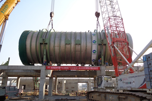 海水淡化Ⅱ标段工程主要施工内容为2台15000d/t海水淡化装置及外部管道的安装。蒸发器是多效热法蒸馏海水淡化装置的关键设备,共7效,分6段进场,其中第5、6效组合体是蒸发器安装的基准效,组合体长21m、最大外径8.1m、重204t。项目部在吊装前充分准备,多次对吊装场地测量检查,精心组织,合理安排,充分发扬“高效严谨、精细务实”的企业作风,克服施工场地狭小、设备运输摆放困难、安装精度高、双相不锈钢焊接难度大等施工困难,以“一天也不耽误、一天也不懈怠”的进取精神,积极践行“24小时工作法”,确保了第5、6效蒸发器组合体的顺利吊装。