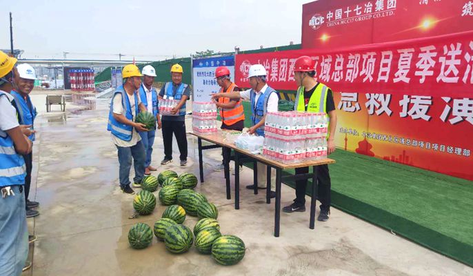 为保障一线作业人员健康安全、持续推进项目大干快上,项目部特为一线人员在炎炎夏日里送去了一丝清凉。活动中,项目部向一线作业人员普及了劳动防护和防暑降温相关安全知识,同时为施工现场桩基和土方施工人员发放了西瓜、凉茶、人丹、绿豆汤、矿泉水、风油精、花露水、藿香正气水等清凉解暑物品。
