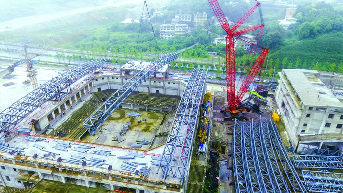 贵州息烽体育馆项目包括综合馆、全民健身中心、酒店在内的两座运动场馆及一套酒店式公寓,总建筑面积67686.51平方米,其中地下面积29817.14平方米,地上面积37869.37平方米。该项目钢结构工程包含综合馆钢结构屋盖工程及全民健身中心钢结构屋盖工程,共计17榀主桁架,其中4榀原位拼装,13榀地面拼装完成后采用履带吊吊装。主体结构形式为型钢混凝土框架结构,其中全民健身中心层数五层,局部一层,地下室一层;综合馆地上三层,地下一层。