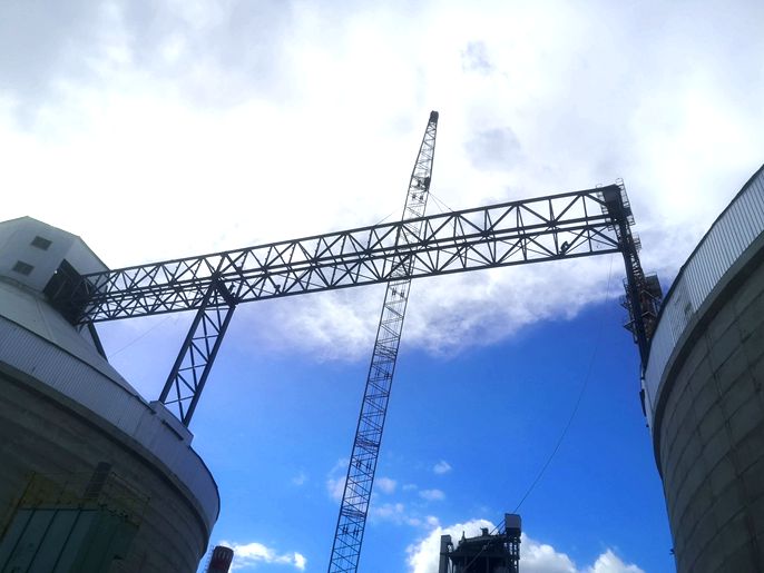 1#、2#熟料库库间输送钢桁架吊装工程被形象的称为“空中通廊”,是本项目钢结构吊装过程中的重点工程,也是本项目难度最大的吊装工程之一。为完成该任务目标,项目部克服起重高度大、设备短缺、起重量和构件跨度大、吊装作业环境复杂的难题,积极组织专业技术人员编制安全专项施工方案,对起重吊装过程中的吊车回转半径、构件牵引、钢丝绳受力分析等各参数进行了详细的验算,经公司及现场监理业主确认后进行吊装工作。施工过程中,专业人员精心指导,精心布置吊装流程,合理安排施工顺序,历时3天顺利完成吊装任务,实现1#、2#熟料库库间输送钢桁架全线贯通。至此,项目2#熟料库全面启用,减轻了1#熟料库的储存压力,也进一步降低了停窑的风险。