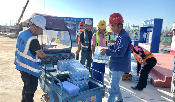 各项目部相关负责人给正在火热施工的各区域工程送去了风油精、藿香正气水、人丹、速效救心丸、防暑降温茶叶、十滴水、绿豆、盐汽水、西瓜、矿泉水等防暑降温及急救物品。为确保夏季高温天气施工计划高效平稳向前推进,各项目部提前调整作息时间,坚持“干两头、避中间”,避开高温作业时间,并为员工准备了绿豆汤等清凉降温的食物,力保员工身体健康、干得顺心舒心。