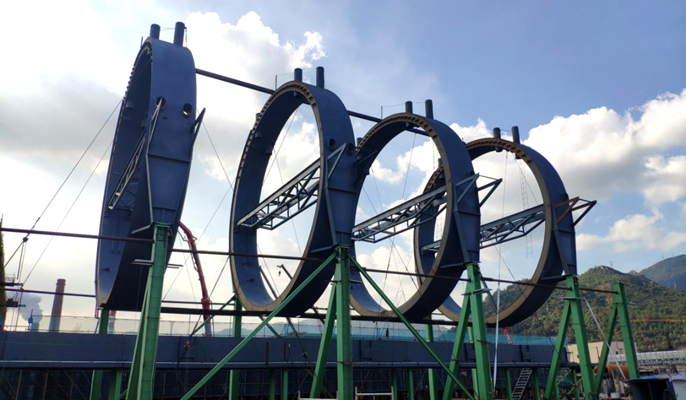 宝钢德盛新炼钢(一步)工程共计9座除尘器,其中煤气除尘是唯一一台干法除尘设备。相比与其他8座除尘器,干法除尘最大的优点就是能耗低、耗水量小,环保效果更加明显,净化后的烟气含尘量远低于国家规定的排放指标。单个煤气除尘有6片环形梁,本次完成的是中部4片的吊装工作。环形梁的直径为12600毫米,单重为34.8吨,采用220吨汽车吊吊装就位。