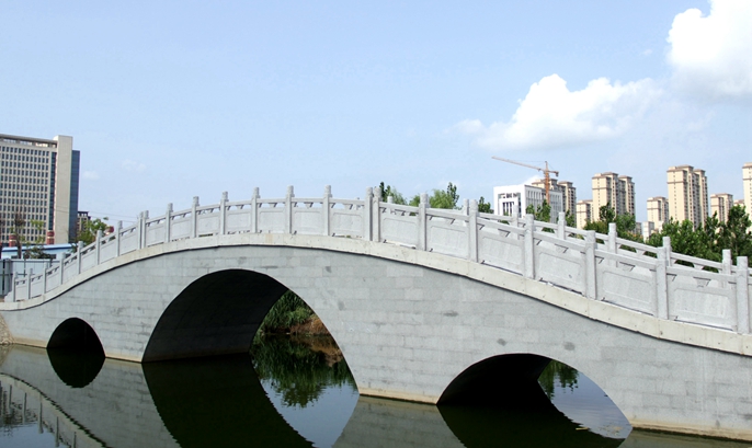 此次竣工的两座景观桥梁分别是四季河公园的三孔桥和七孔桥,结构形式均为钢筋混凝土半圆拱桥,三孔桥跨度24米,七孔桥跨度53米,主要功能为连接府前广场与人民公园。