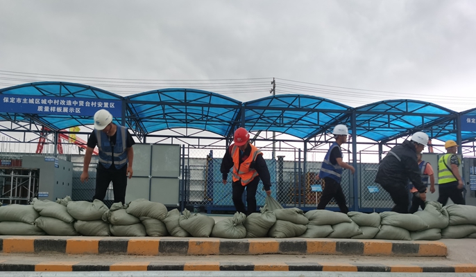 自保定市地方气象部门发布强暴雨信息以来,保定市ABO项目部迅速做出反应,及时启动防汛应急预案,组织项目全体管理人员,成立防汛救援应急小组,提前储备应急物资。项目部防汛救援应急小组装袋运送200余袋防汛沙包,对可能出现险情的部位进行加固;同时组织专人排查施工场地隐患部位,及时标识、整改;提前安放抽水泵,做好排水准备。