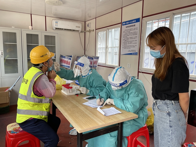 检测采样现场,项目部安排专人负责维持秩序,提前检查待测人员健康码、行程卡,做好信息登记,有序进行检测采样。按照“应检尽检“的原则,逐一检测,建立起施工现场防疫第一道屏障,确保全员参与、全员预防,全员健康的防疫状态。