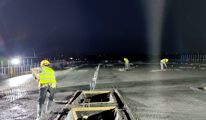 鸡笼山路大桥共计三联七跨,合计255米,大桥箱梁混凝土工程量7444.6立方米。截止目前,大桥第一、二联混凝土已经全部浇筑完成,共计完成工程量5735立方米。面对工期紧、任务重、疫情态势严峻等诸多困难,项目部主动作为,积极落实各项疫情防控工作要求,科学组织资源,统筹安排部署,精心优化施工方案。为确保大桥箱梁混凝土浇筑顺利完成,项目部抢抓晴好天气,开启昼夜攻坚模式,对参建队伍进行安全、技术、质量等方面层层交底,严格调试模板安装、混凝土配合比、混凝土浇注速度及振捣。浇筑完成及时对混凝土进行覆盖浇水养护,切实保证了大体积桥梁混凝土浇筑质量。