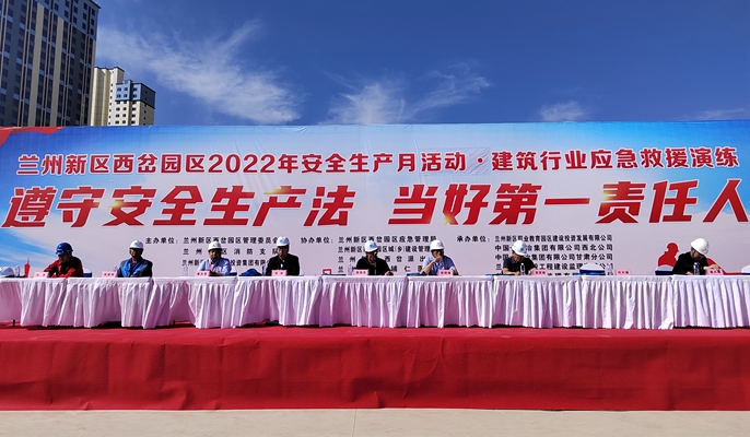 6月10日,兰州新区西岔园区2022年“安全生产月”暨建筑业应急救援演练在中国十七冶集团甘肃分公司兰州新区西岔园区保障性租赁住房(瑞岭翰林郡)项目举办,兰州新区西岔园区管委会副主任周鸿杰、西岔园区建交局局长赵彦峰、应急管理局局长马忠、甘肃分公司副经理白大镜等参加活动。